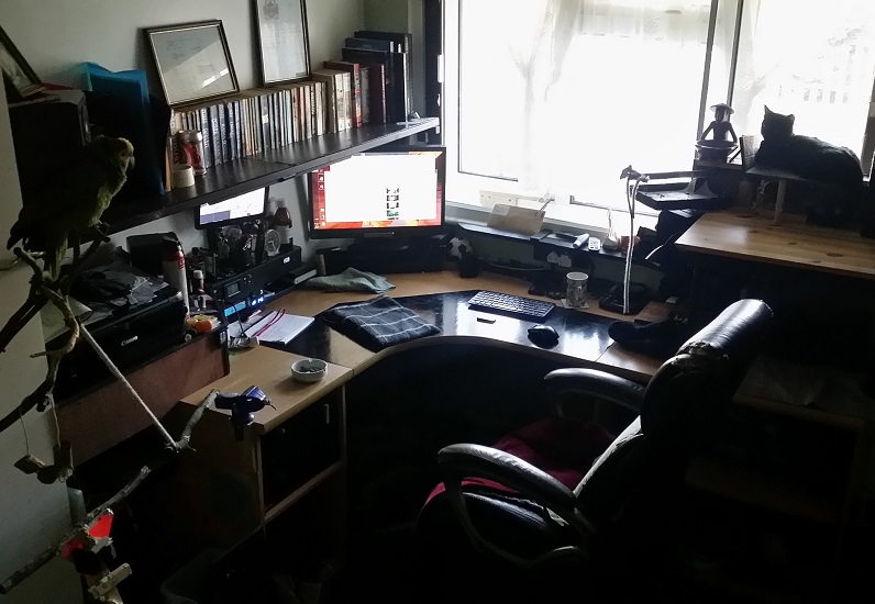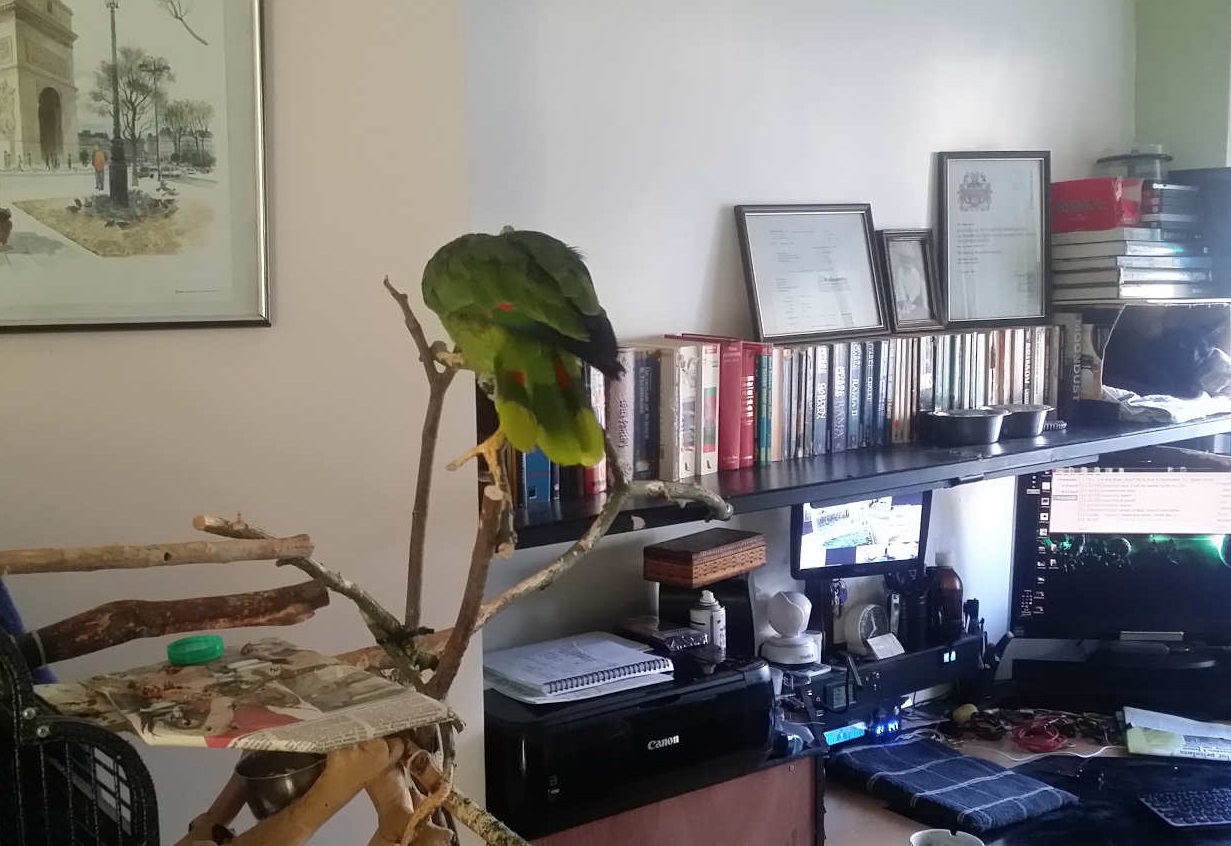 Actually, I am a very bad example. You should not have a bird on your shoulder, the potential for injury is very high, believe me the danger is very real, I have seen some extremely horrific facial injuries where people have had something like a macaw or a cockatoo on their shoulder and the bird has become startled causing it to rip off half their face. So, be advised, it is not a good idea to allow a bird on your shoulder... Unless you have a bond and trust that runs BOTH WAYS, particularly something the size of a macaw, most often with a singular determination that can turn a six foot piece of 2 x 4 into match sticks in about five minutes!